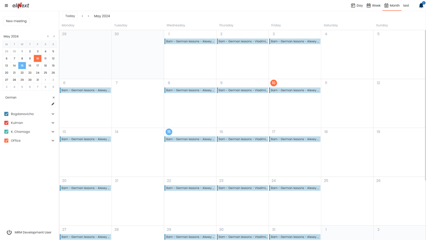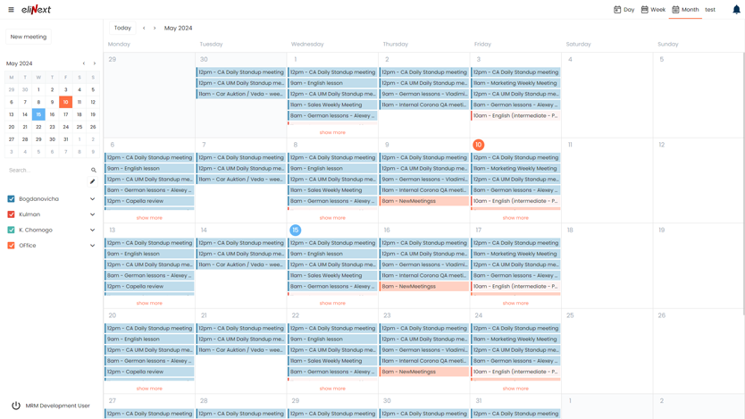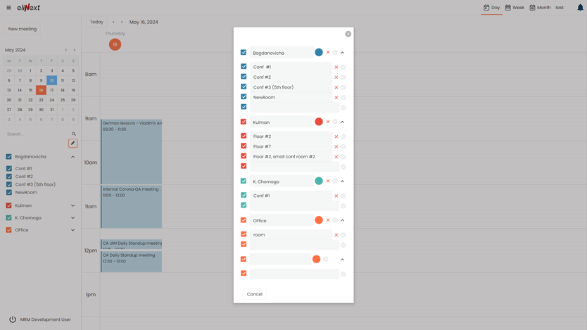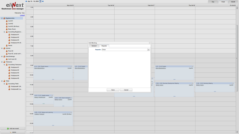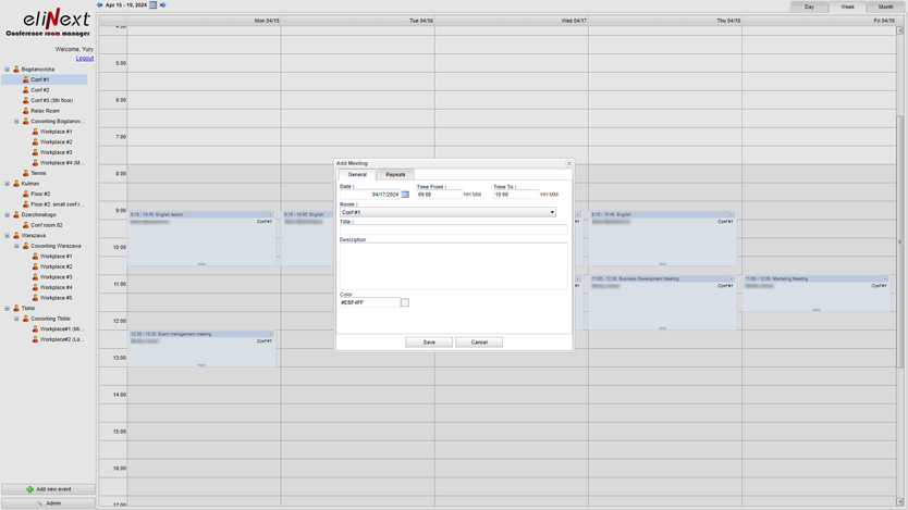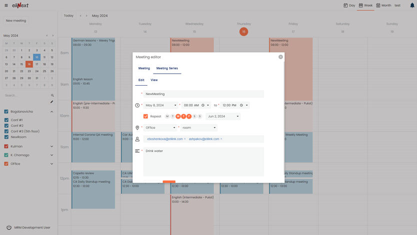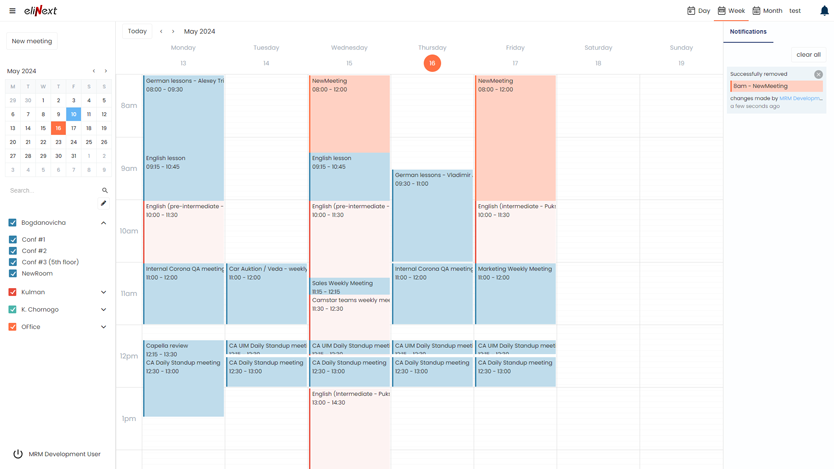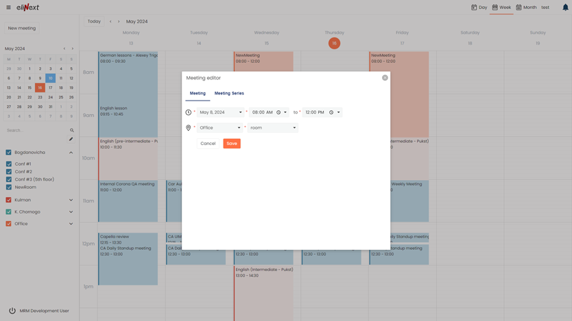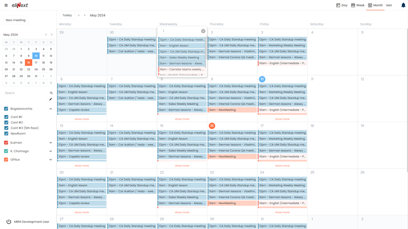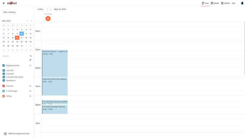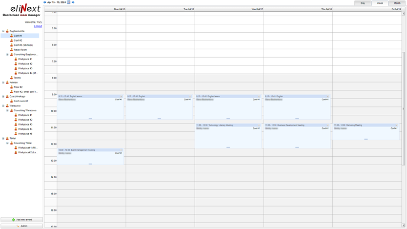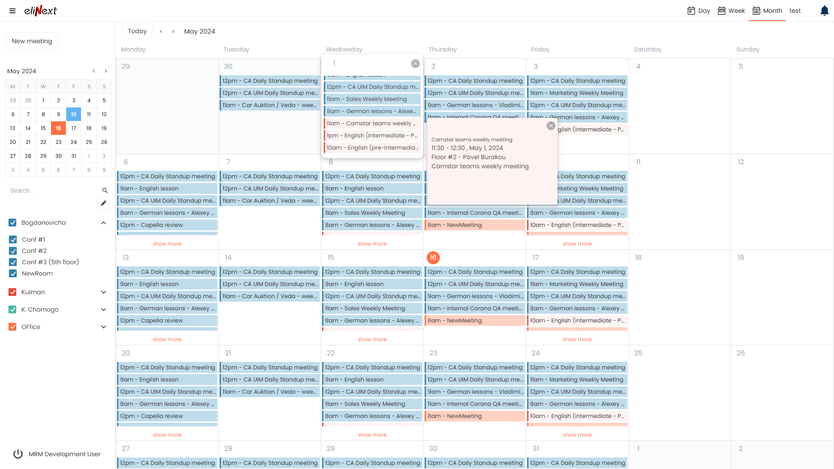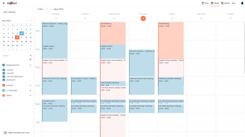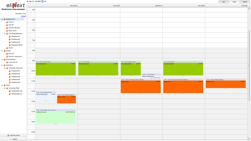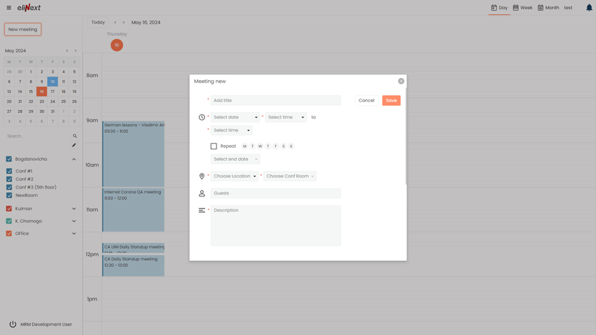Conference room manager (aka Meeting Room Management aka MRM) is a tool for employees to find out what events could be taking place in Elinext conference rooms. It allows booking the room on a specific day and time.