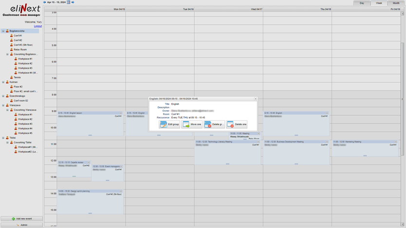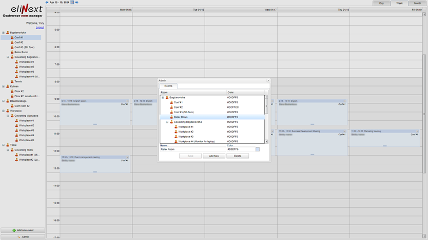 The grid displays all the events that are planned in the selected room or group of rooms. If a group of rooms is selected, then each individual event is highlighted in the color of the corresponding office. One could choose the color of the office in the admin panel.