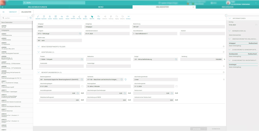 A submodule where a company can create an asset they purchased and fill in the following information: the type of asset, start date of use, the owner and budget of an asset, and details on depreciation.