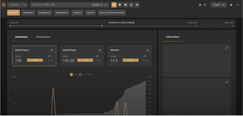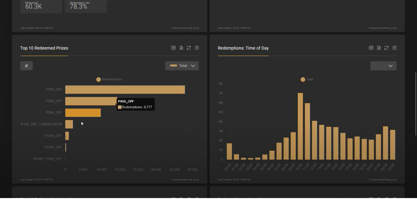 All analytics, statistics, and reporting of the end-users (the clients of the marketing service, i.e. shops, restaurants, etc) were added by the Elinext team. The client can view all user’s activity: times the games were played, number of prizes received, top prizes, daily redemptions, time from win to redemption, etc. The solution allows real-time reporting and statistics for big data (over 1 000 000 rows). It’s possible to download Excel reports, visual analytics, data aggregation reports, etc.