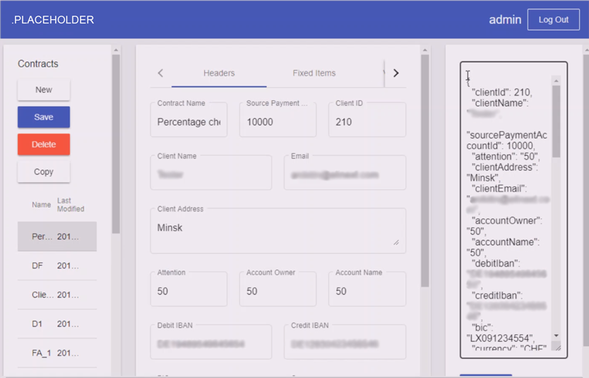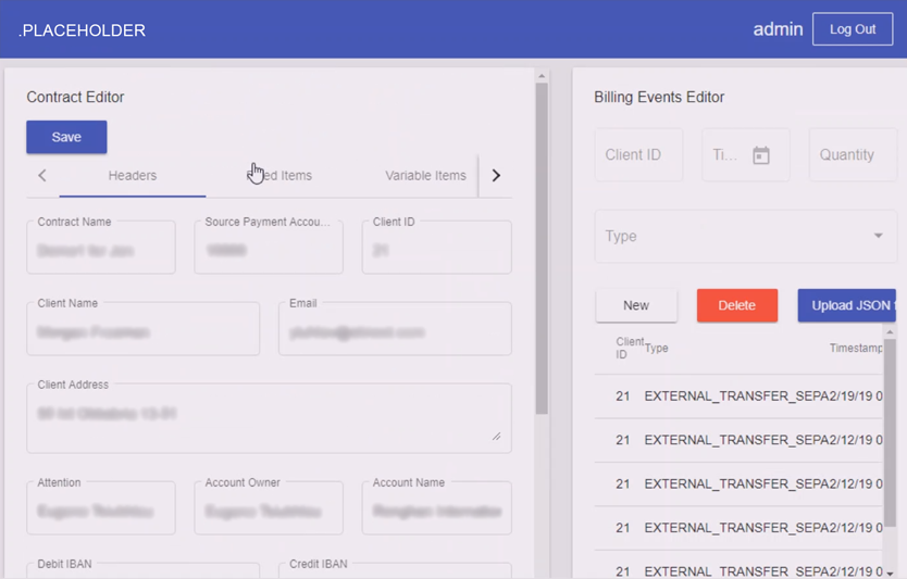 Contracts work as digital agreements within the system, comprising business rules unique for each customer. These rules define how the system calculates each event’s fee based on the event type, time, and amount of money processed (quantity).
