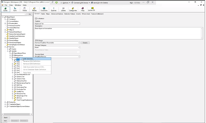 System administrators can manage databases, services, queries, and transactions in a visual workspace. The workspace is structured as a layer cake, where each of those entities is linked to a respective class. Creating classes is the next level of configuring the system, where you can also tweak the application’s logic and link elements together.