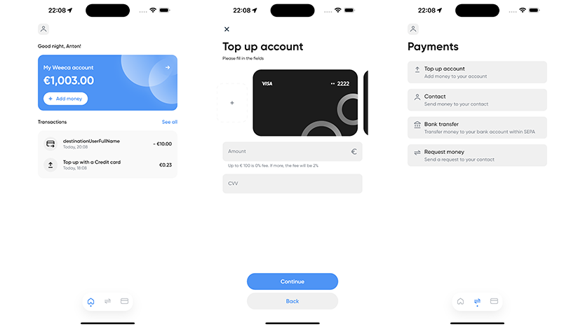 In this module, one could see account details (such as IBAN and current balance), top up the balance, and make bank transfers to own account outside of the app.