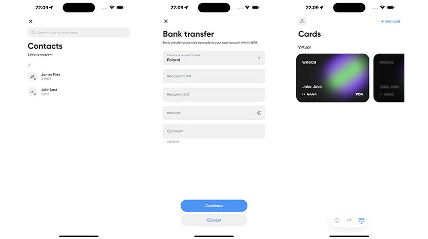 Our requirements included a simple and user-friendly interface that would allow verifying user identity, creating virtual and physical cards, and working with cryptocurrencies. Among other functions included in the MVP version of the product were opportunities to top up your account, add cards to Apple Wallet, send money to your contacts, make SEPA transfers, see the list of transactions, and many others.