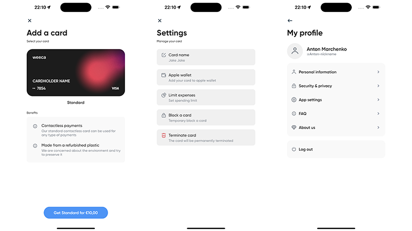 This block allows users to commit all the operations connected with the cards (creating, blocking, terminating, viewing card details, and organizing the delivery of physical cards). Both virtual and physical card management are available in the app.