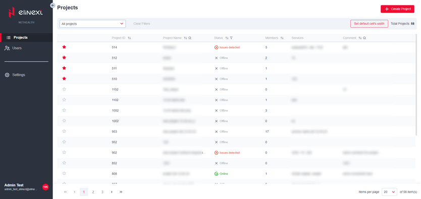 In the projects grid, the user can quickly observe the state of all objects overall – every project inherits status from the services inside of it.
