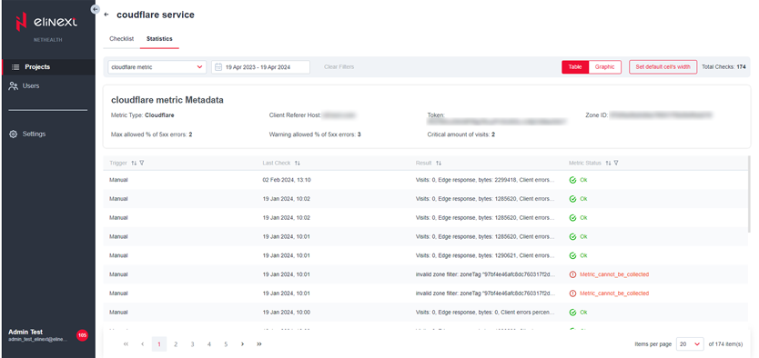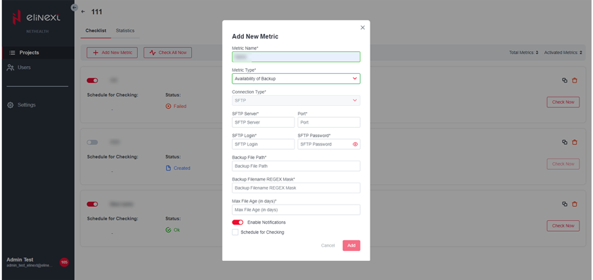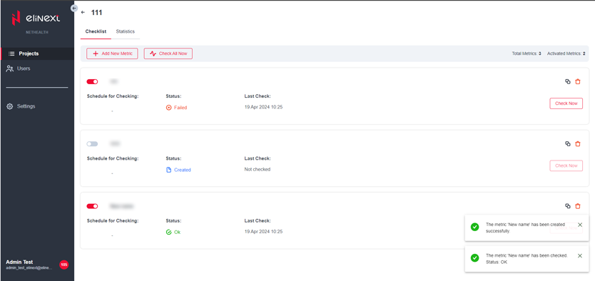 The user can add and monitor various metrics related to the service. The admin can set the schedule for checking once and then receive notifications in case something gone wrong or check one or all the metrics manually to see the latest updates.