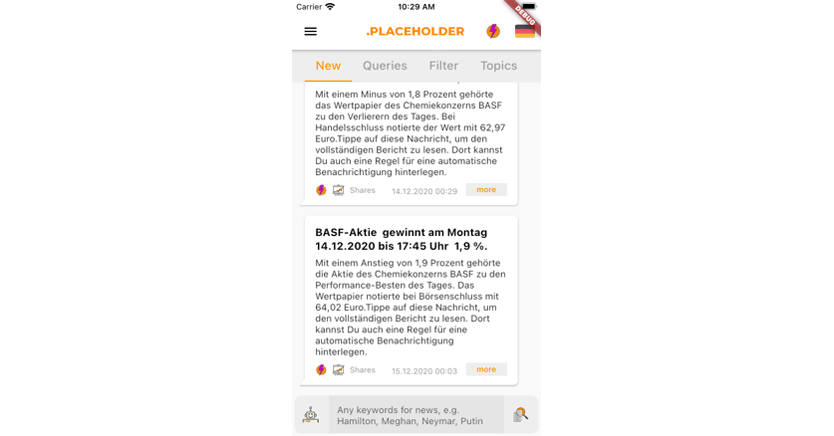 The app’s main feature is the newsfeed in the tab New. It shows the latest publications from partners and free sources, automatically translated into the user’s language if it differs from the original. The user can switch between newsfeed channels dedicated to topics like weather, football, commerce, finance, celebrities, etc.
