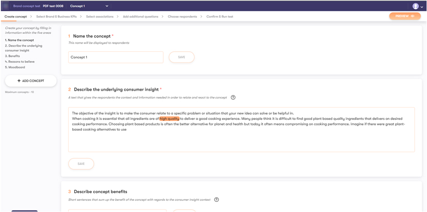 Step 1 — create a concept test, fill in the name, describe its benefits and reasons.