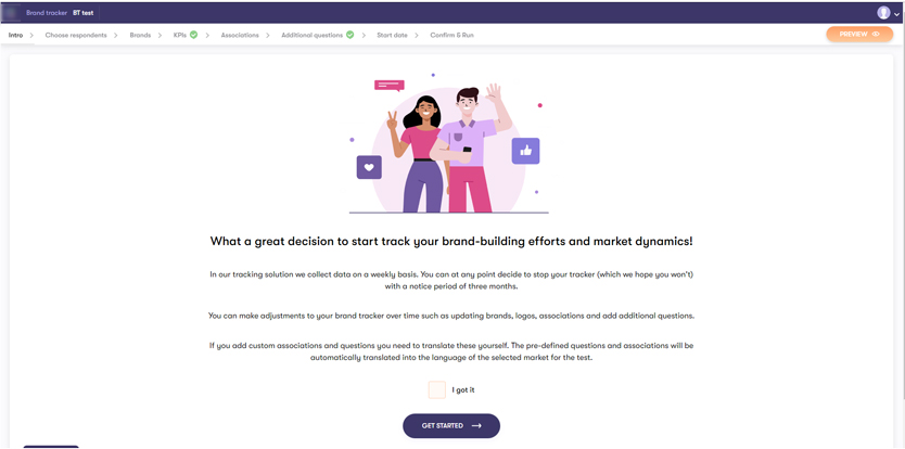 - Brand tracker test. This test allows companies to evaluate their brand using metrics such as brand awareness, customer preferences, key associations, and others.