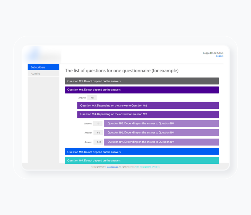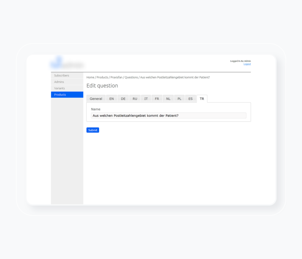 After we helped with custom software development services, the product consists of two major modules: the tablet survey interface and an admin dashboard. The solution is compliant with the modern requirements of today’s healthcare and is universal.Tablet Survey Interface