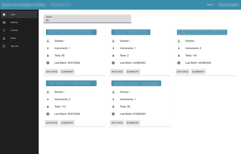 Labs page allows the user to see the summary information about each lab in the application that the user has access to, with the number of instruments inside, and the number of uploaded batches.