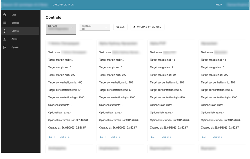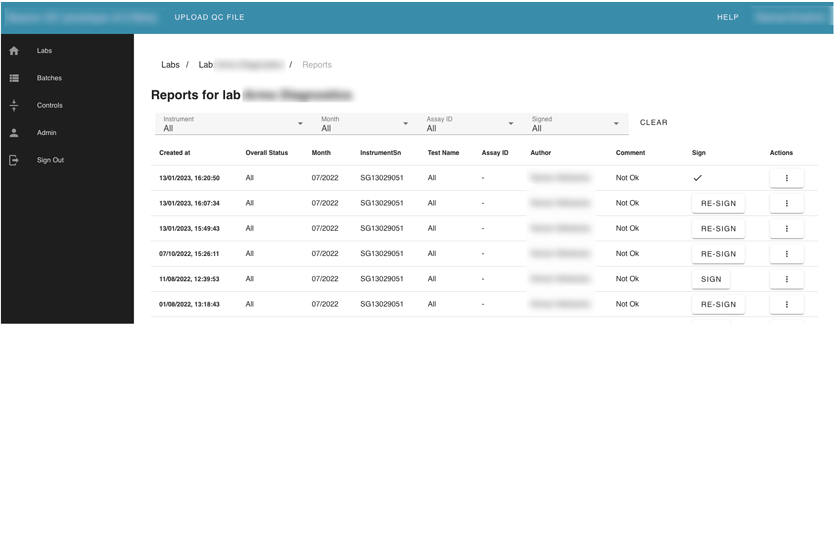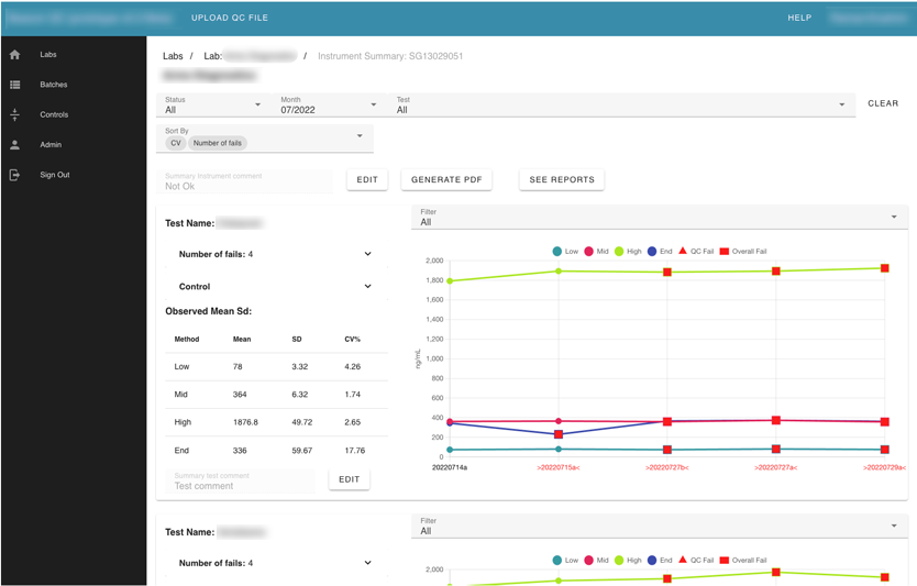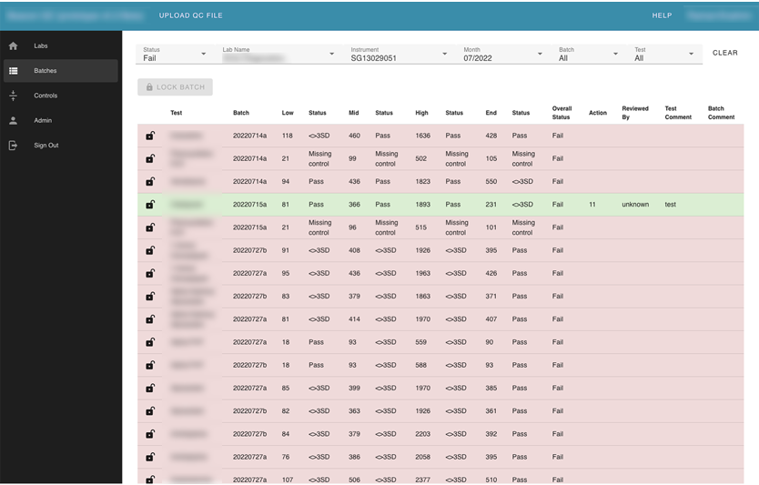 Also, the user can search by label name. Inside each lab card, the user can see its instruments. Inside instruments user can see all batches that were uploaded for this instrument and review every failed test separately. The Reviewer can leave a comment, or mark “a test” with an action.