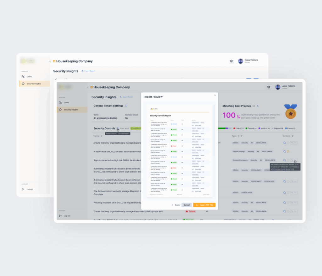 Immediately after implementation, the customer launched a proprietary SaaS platform that clearly differentiates their service offering in the Microsoft 365 consulting market. Security assessments that previously took hours can now be completed in minutes, while automated audit preparation significantly reduced manual effort and improved consistency across engagements. The intuitive user interface enabled fast adoption with minimal training, and early user feedback confirmed high usability and design quality.