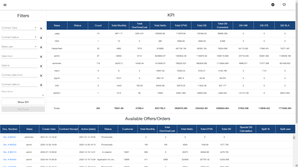 Regional distributors and sales representatives can calculate their profits in the system. And supervisory users can see sales representatives’ performance based on the number of offers and orders processed per month.