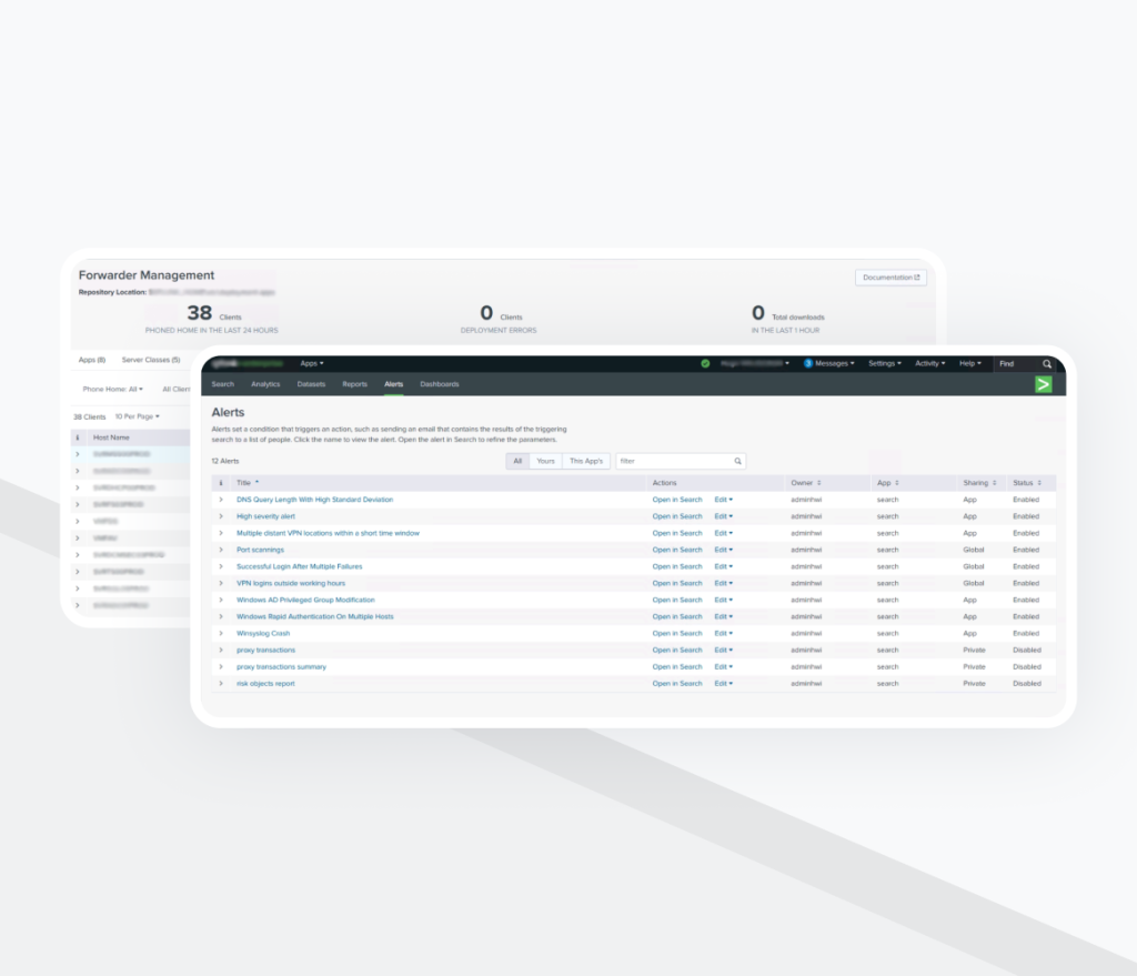 - Automated correlation searches covering key security scenarios (authentication abuse, network anomalies, privileged activity).