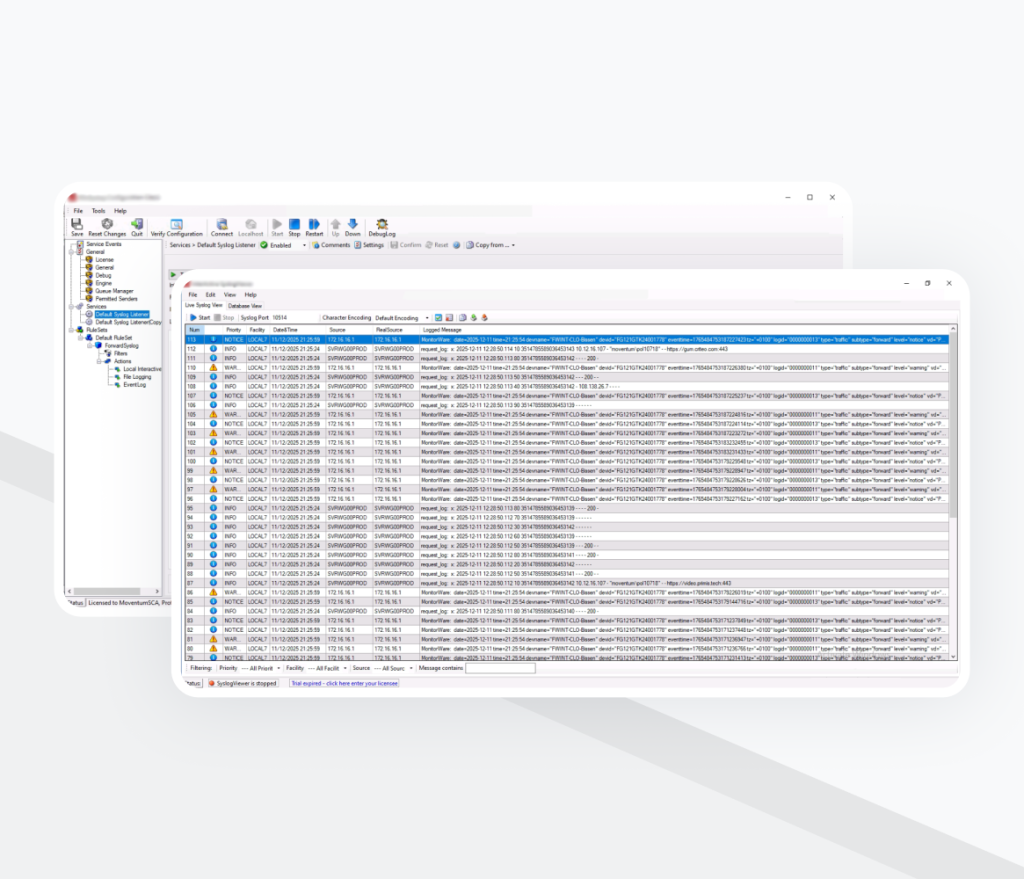 Windows servers sent logs via Splunk forwarders directly to the SIEM server. Firewall, VPN, and proxy logs were delivered to a syslog server, stored as files, and then processed by a forwarder.