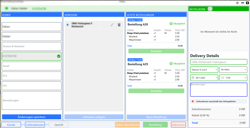 If this customer has ordered before, the form will include their address, email and previous orders details. The latter can be replicated or used as a basis for a new order. And if this is a new customer, the administrator can fill in the details for further use.