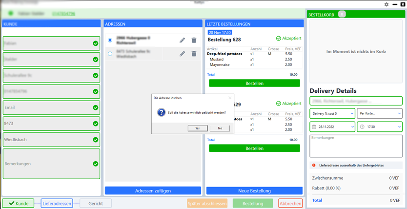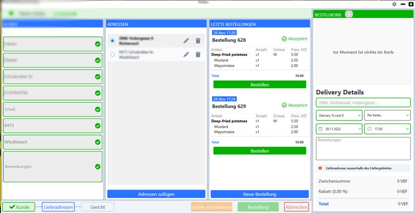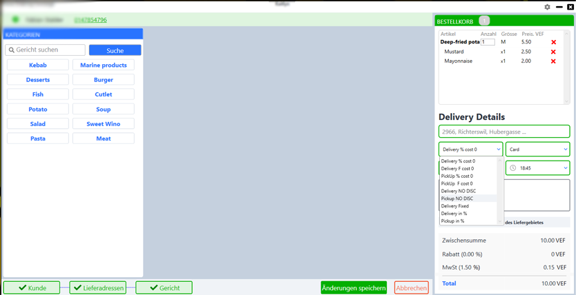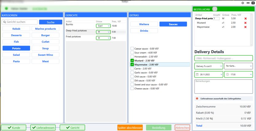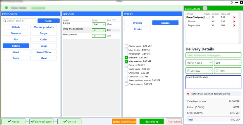 The administrator adds all the items to the virtual cart and specifies parameters like the payment method, service type (delivery or pickup), date and time. If necessary, a note can be added.