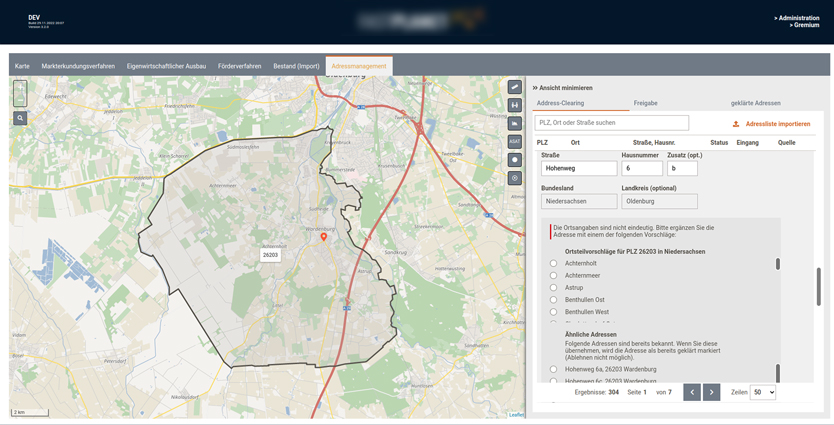 The planner usually enters addresses into the system by uploading them as a list in the address management section. But if someone filling out the list made mistakes in spelling the addresses, the system will not find matches on the map. To help prevent that, we introduced address clearing.