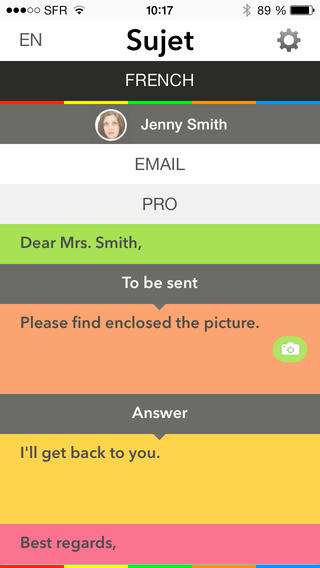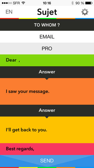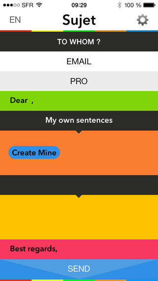 The final product obtained as a result of the development process was a multilingual mobile application for iOS “Sujet”. This iPhone app allows composing a personalized standardized text (email or SMS) in a few simple gestures. Only by «swiping» a finger on the screen, the user can compose a personalized text from «pre-written» sentences.