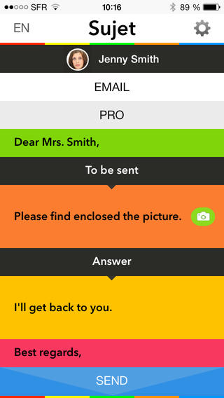 All the composition options (language, email or SMS, styles, categories) can be changed at any time when a text is composed, the text switches then to the corresponding texts in the relative options. Besides, users can «mark» the most frequently chosen people on their contact list. In addition to the core functionality there are two more essential options: a «send feedback» option and a «suggest a text» option. Both options trigger a mail directly to feedback(at)sujetapp.com with the corresponding subject already entered.