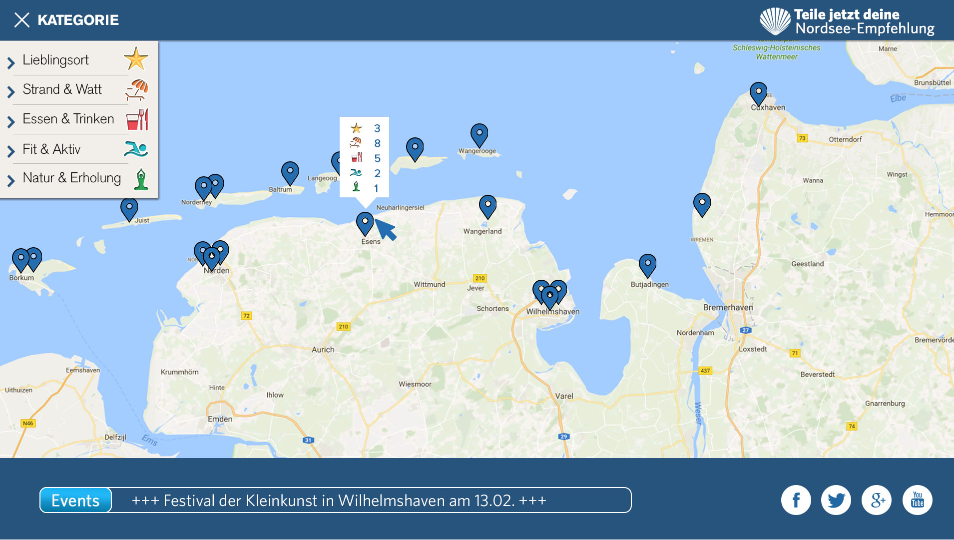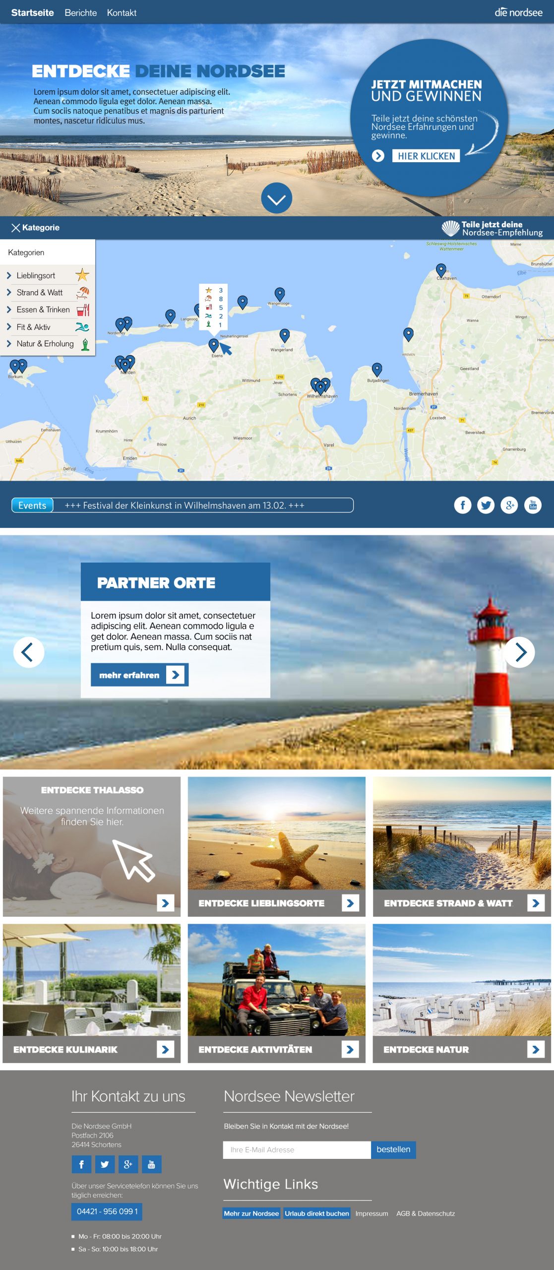 A major German advertising company wanted to create a website for travelers to attract them to the North Sea Area. To meet this challenge and build loyalty to this region, the customer decided to create a visual map with photos showing real travelers’ emotions followed by text feedbacks.