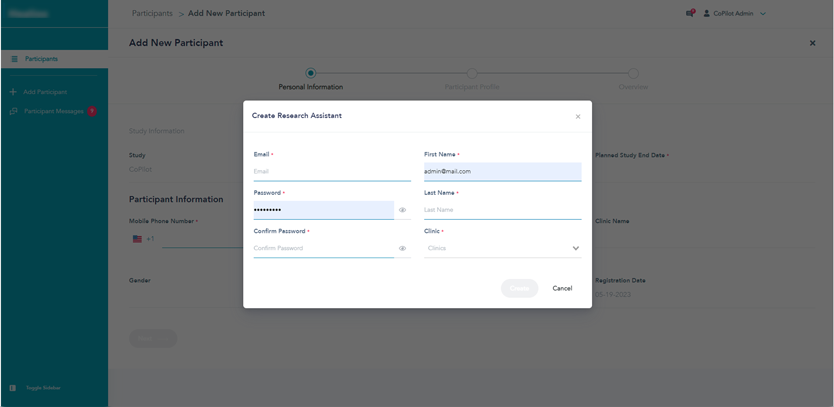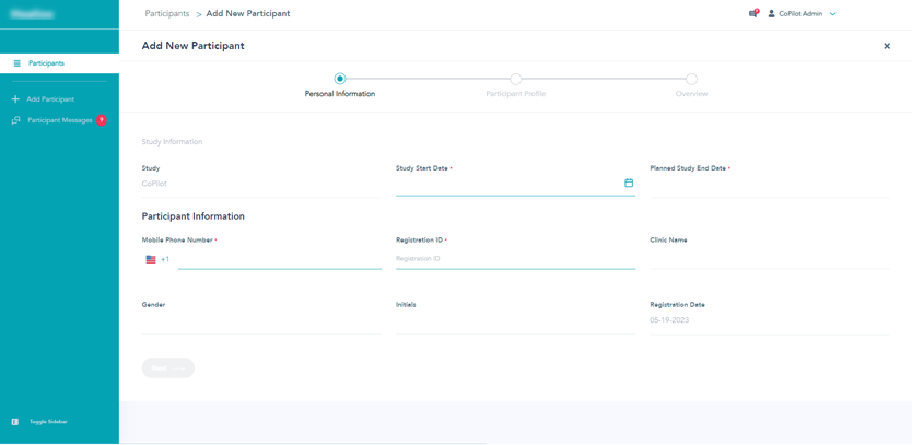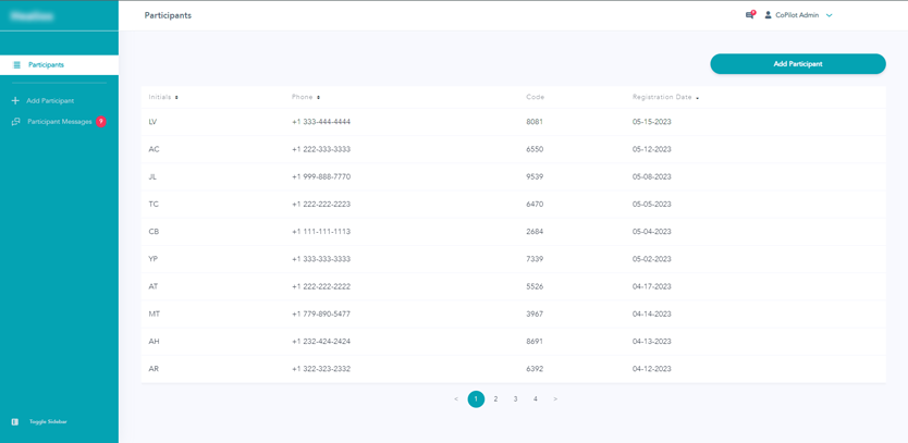 The Participant flow allows the portal user (Admin or Research Assistant) to add a new patient (the user of the mobile app) to the web portal. A 3-step flow makes sure all data is filled, encrypted, and validated. The data includes basic information (phone number, Registration ID, Clinic Name, Initials, etc.), the patient’s Goals and Strengths added by their doctor, as well as the patient’s Wellness plan.