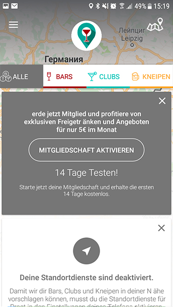 The app should promote bars and restaurants all across Germany and help visitors discover new places. The main idea of the project is to offer application users one free drink a day in any partner facility on the basis of a monthly paid subscription thus letting them discover new places throughout the country. For barkeepers, this is a good platform to advertise their place among mobile users and turn them into real customers.
