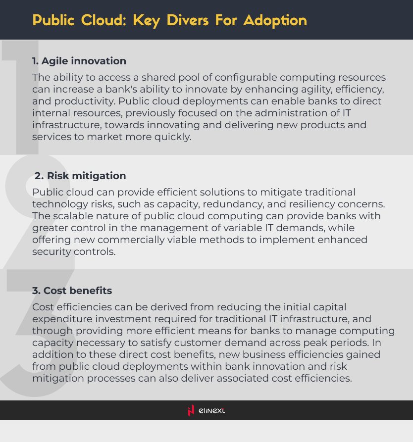 Returning to the reasons, the British Bankers’ Association (BBA) sees the following three key motivators for the adoption of public cloud-based services by the banks: