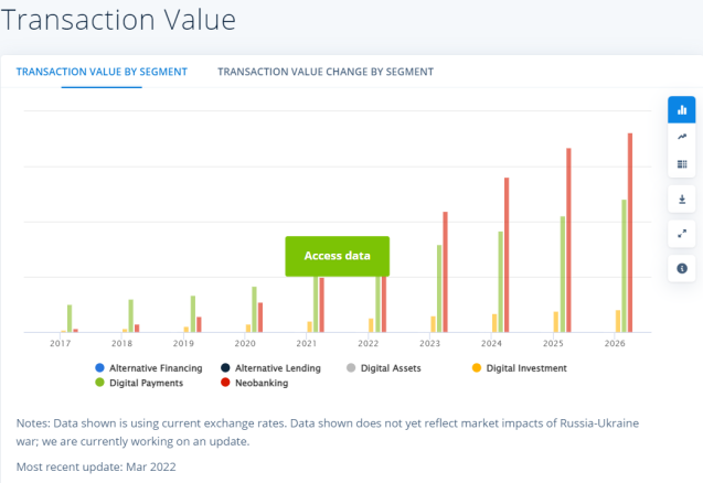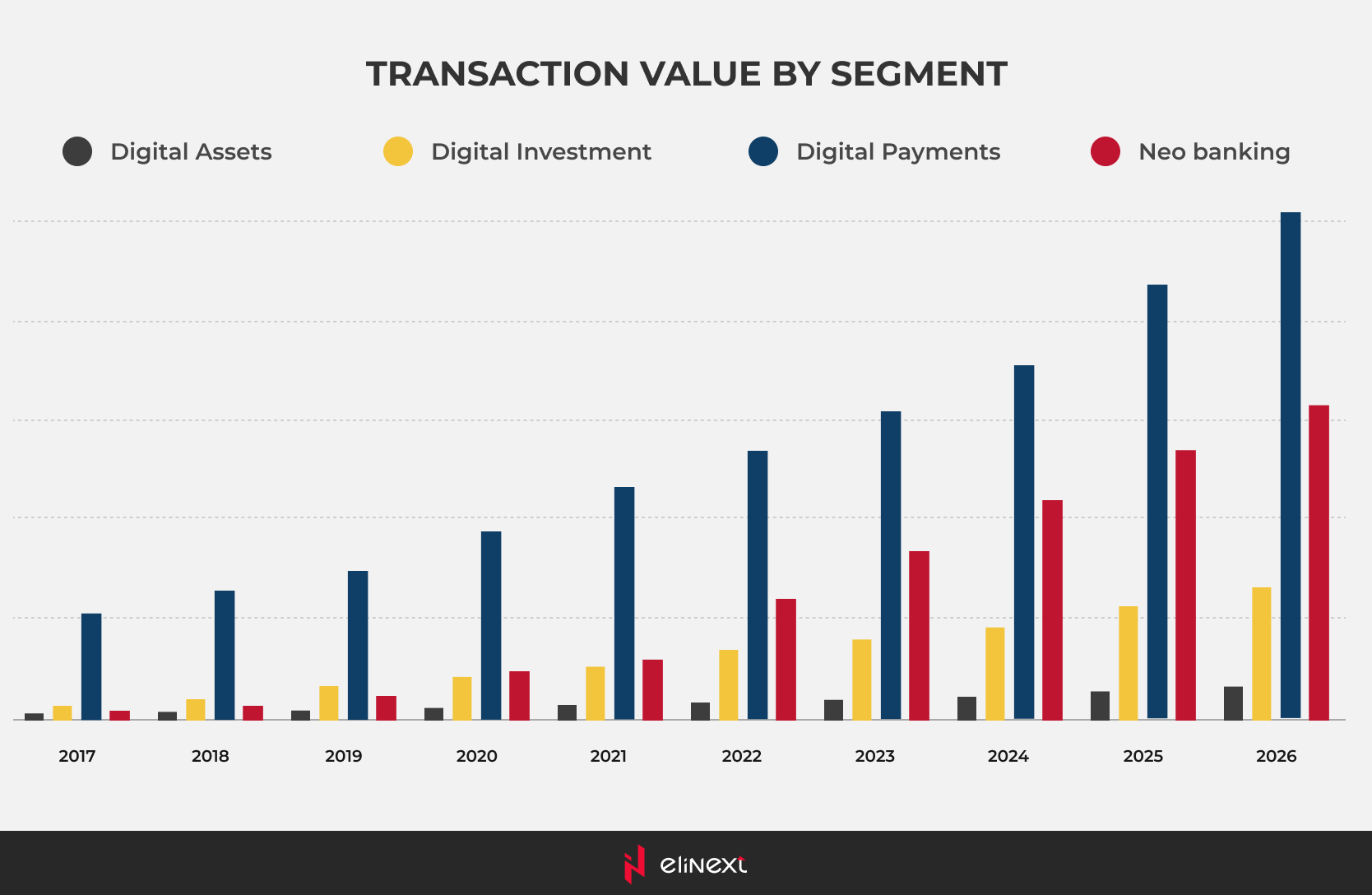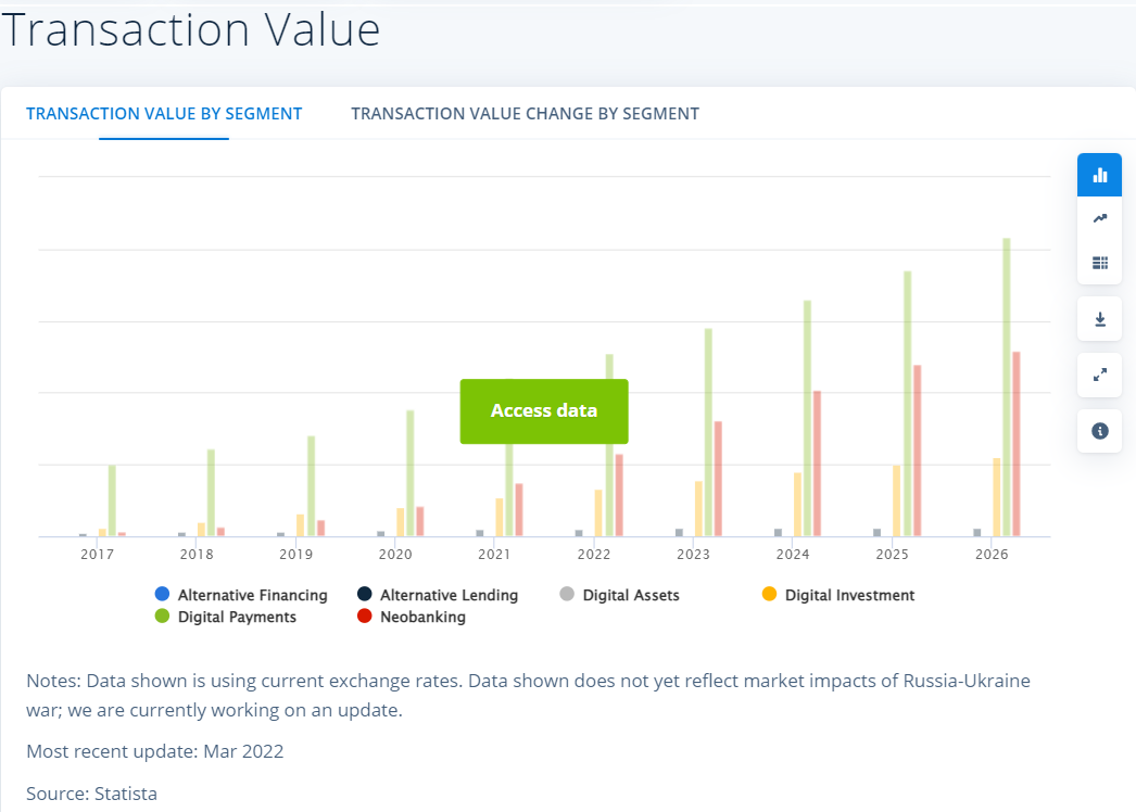 According to Statista, in 2022, Digital Payments will become the market’s largest segment with an impressive total transaction value of no less than US$8,502.00bn. By 2026, the number of Digital Payments users is expected to reach 5,197.44m. By 2023, the revenue growth of the Neobanking segment is expected to reach 40.3%.