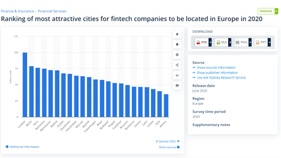 As of 2020, Statista ranks London as the leading FinTech hub, followed by Berlin, Paris, Barcelona, and Manchester. The index score is based on vital criteria such as demographics, business environment, and talent and innovation.