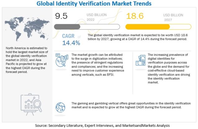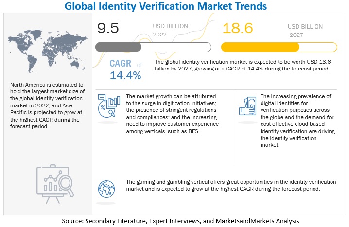 According to MarketsandMarkets, in 2022, the global identity verification market was valued at $9.5 billion and it is expected to grow at a CAGR of 14.4%, reaching $18.6 billion by 2027.