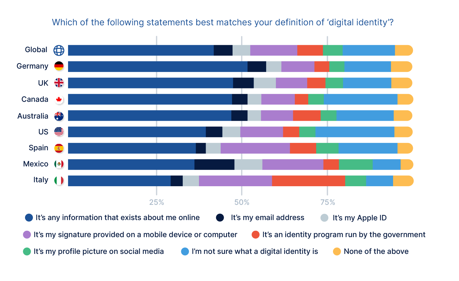 When digging deeper into the respondents’ understanding of digital identity, 52% of the German respondents were the closest to the truth, opting for ‘any information that exists about me online’.