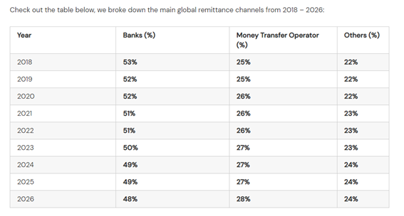 According to the same source, by 2026, banks will keep dominating the sector, channeling 48% of the funds. Meanwhile, Money Transfer Operators are expected to channel 28% of the funds.