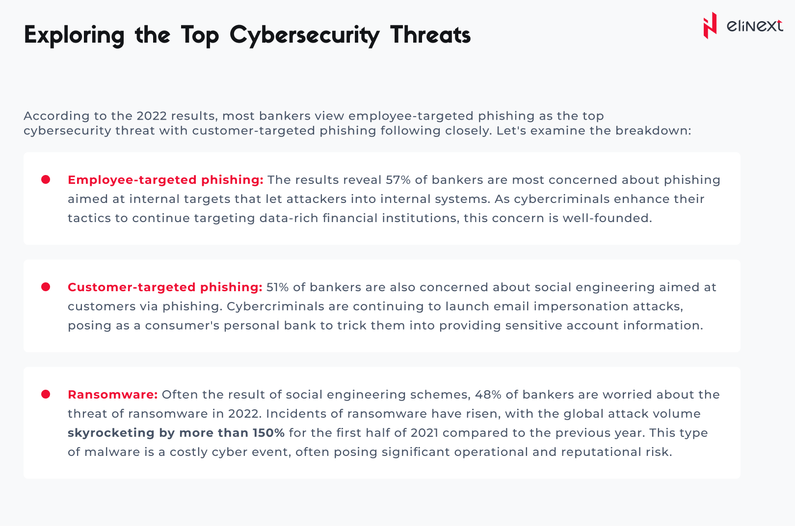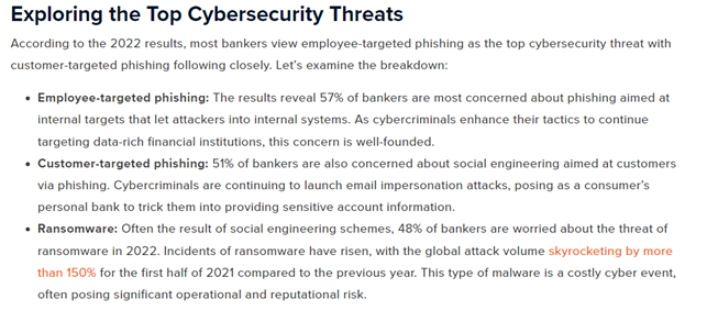 These statistics are already disruptive without even mentioning the spike in cyberattacks – such as DDoS attacks, ransomware, infostealer malware, or botnets– that financial and banking institutions need to deal with. According to CSI, these are the main cybersecurity threats as of 2022: