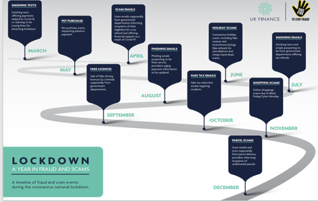 According to a report published by UK Finance, the pandemic forced people to work remotely, shop online, check e-mails regularly, opt for online services such as mobile banking, etc. The always-connected phenomenon forced cybercriminals to diversify their tactics. The report presents a timeline of the most common frauds and scams during the pandemic: