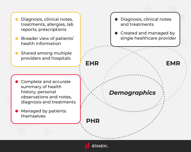 With similar features to EHRs, PHRs are patient-centered systems that patients manage directly in a confidential and secure environment. Basically, EHRs and PHRs store similar health data: medical history, medication, demographic data, immunization dates, allergies, diagnoses, etc. However, PHRs are enabled to store information that comes from other sources as well: