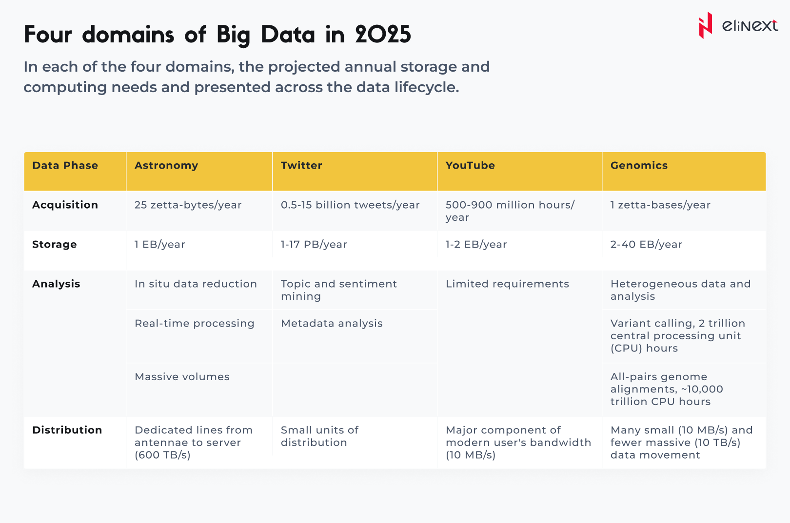 Considering that one single human genome sequence would take up the space of approx. 200 copies of Jaws, there is no wonder that genomics is currently considered a Big Data science, expected to soon be on par – in terms of data acquisition, storage, distribution, and analysis – with some of the biggest data generators: YouTube, Twitter, and astronomy.
