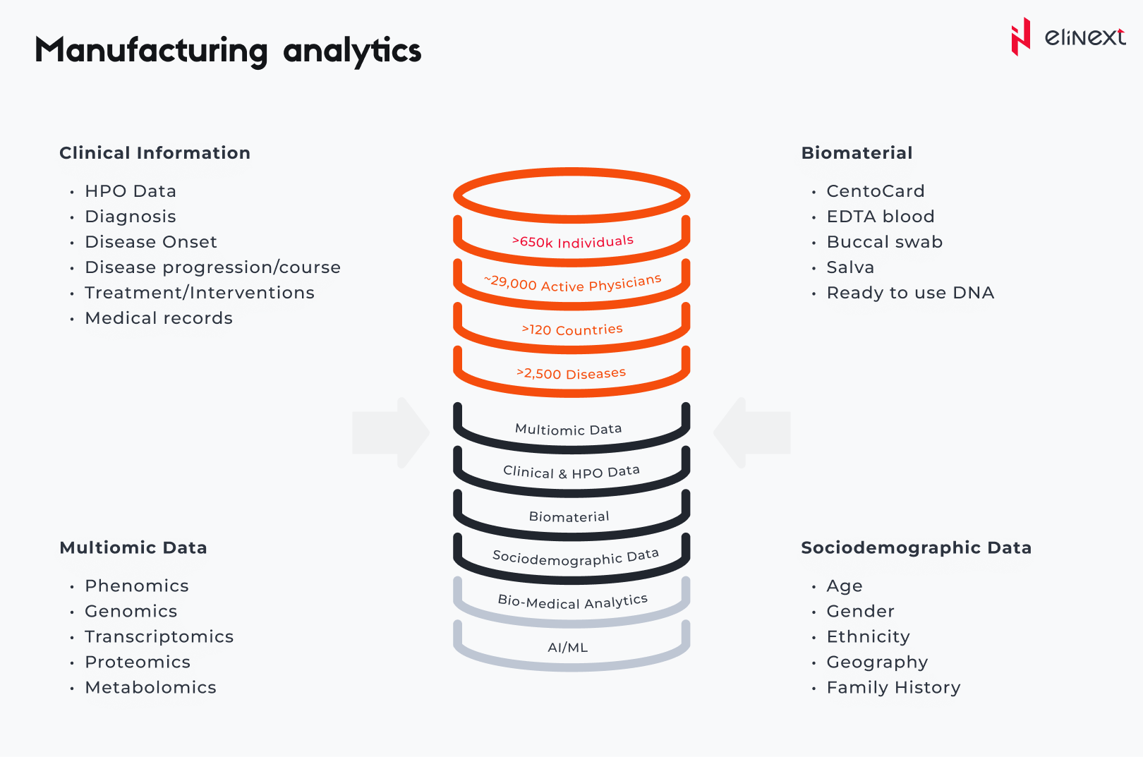 Aimed at facilitating state-of-the-art genomic testing and generating comprehensive medical reports, this fully-automated bioinformatics pipeline is supported by CENTOGENE’s Biodatabank, one of the largest data repositories in the world for neurodegenerative and rare diseases. Using standard and AI-powered clinical data extraction, CENTOGENE’s Biodatabank combines clinical information, multi-omic data, sociodemographic data, and biomaterial.
