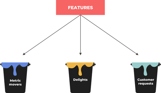 Feature buckets that categorize features into metric movers, customer requests, and customer delights.