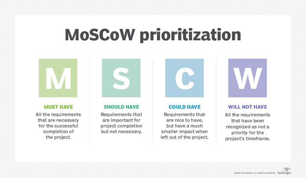 - MoSCoW matrix that divides features into logical subcategories: must-have, should-have, could-have, and won’t have this time.