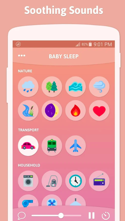 The app lets users mix classic white, pink, and brown noises (e.g., thunder and waterfall sounds) with everyday sounds, sounds of nature, and lullabies. For example, the application contains quite realistic sounds of a vacuum cleaner, a car, street noises, a working washing machine, a hair dryer, a fan, a vacuum cleaner, and other equipment that can create monotonous, low-frequency waves. Moreover, users can turn individual sounds on and off and set a timer.