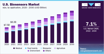 With biosensors already dominating the medical field and projected to become key components in a wide array of industries (e.g. food industry, imaging, agriculture, etc.), there is no wonder that, in 2021, the value of the global biosensors market reached USD 24.9 billion. According to Grand View Research, from 2022 to 2030, the global biosensors market will keep expanding at a CAGR of 8.0%.