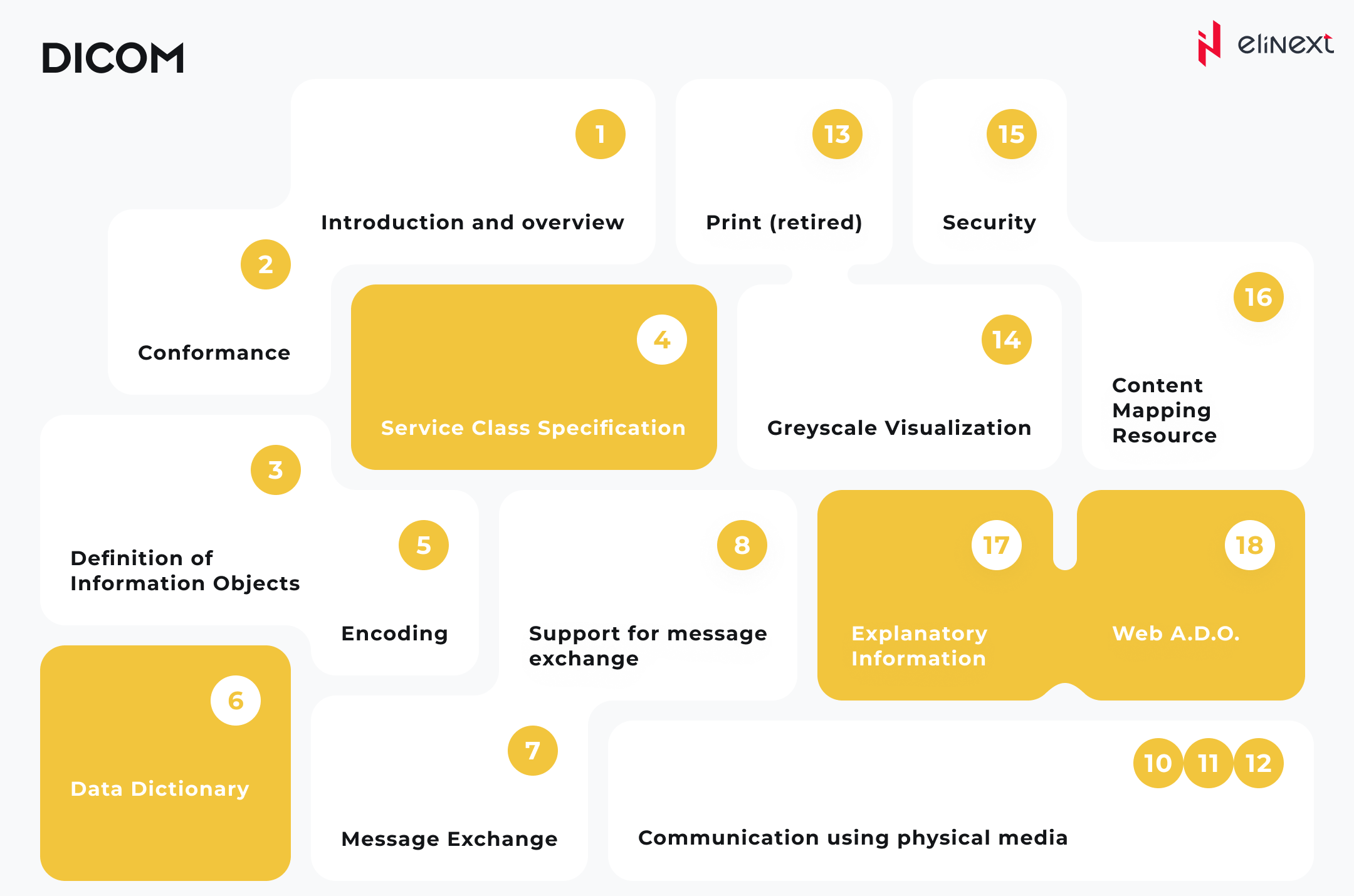 DICOM doesn’t just define sets of images and data; it also covers the transport protocol and various other services. As of now, the entire standard comprises 22 interconnected yet standalone sections. For instance, there are sections that encompass: