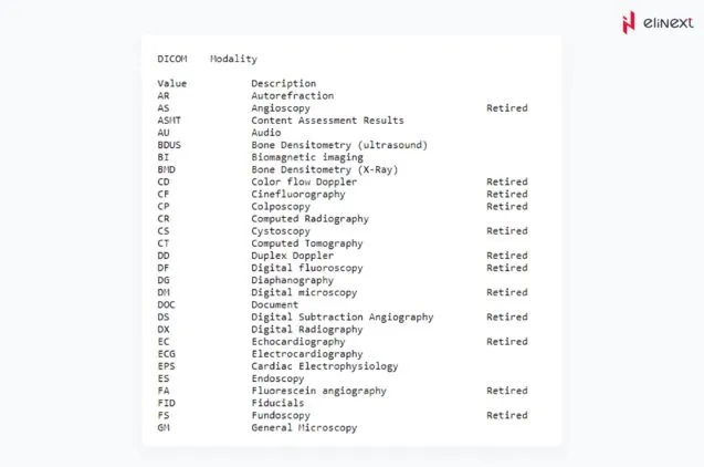 A DICOM data object comprises a set of attributes, including elements such as the patient’s name and identifier, as well as attributes containing information about pixel images. One of these attributes is the modality, which represents the file type. You can also think of it as the type of equipment used to obtain the file. DICOM establishes a functional list of modalities.