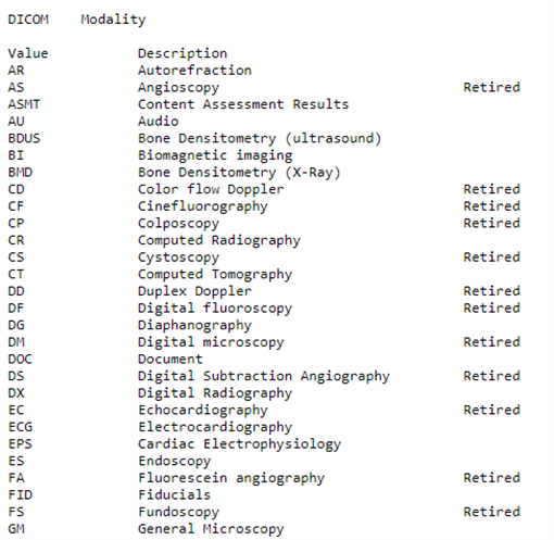 A DICOM data object comprises a set of attributes, including elements such as the patient’s name and identifier, as well as attributes containing information about pixel images. One of these attributes is the modality, which represents the file type. You can also think of it as the type of equipment used to obtain the file. DICOM establishes a functional list of modalities.