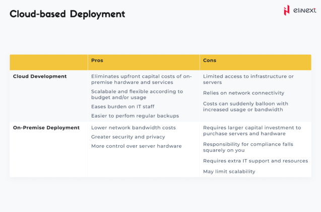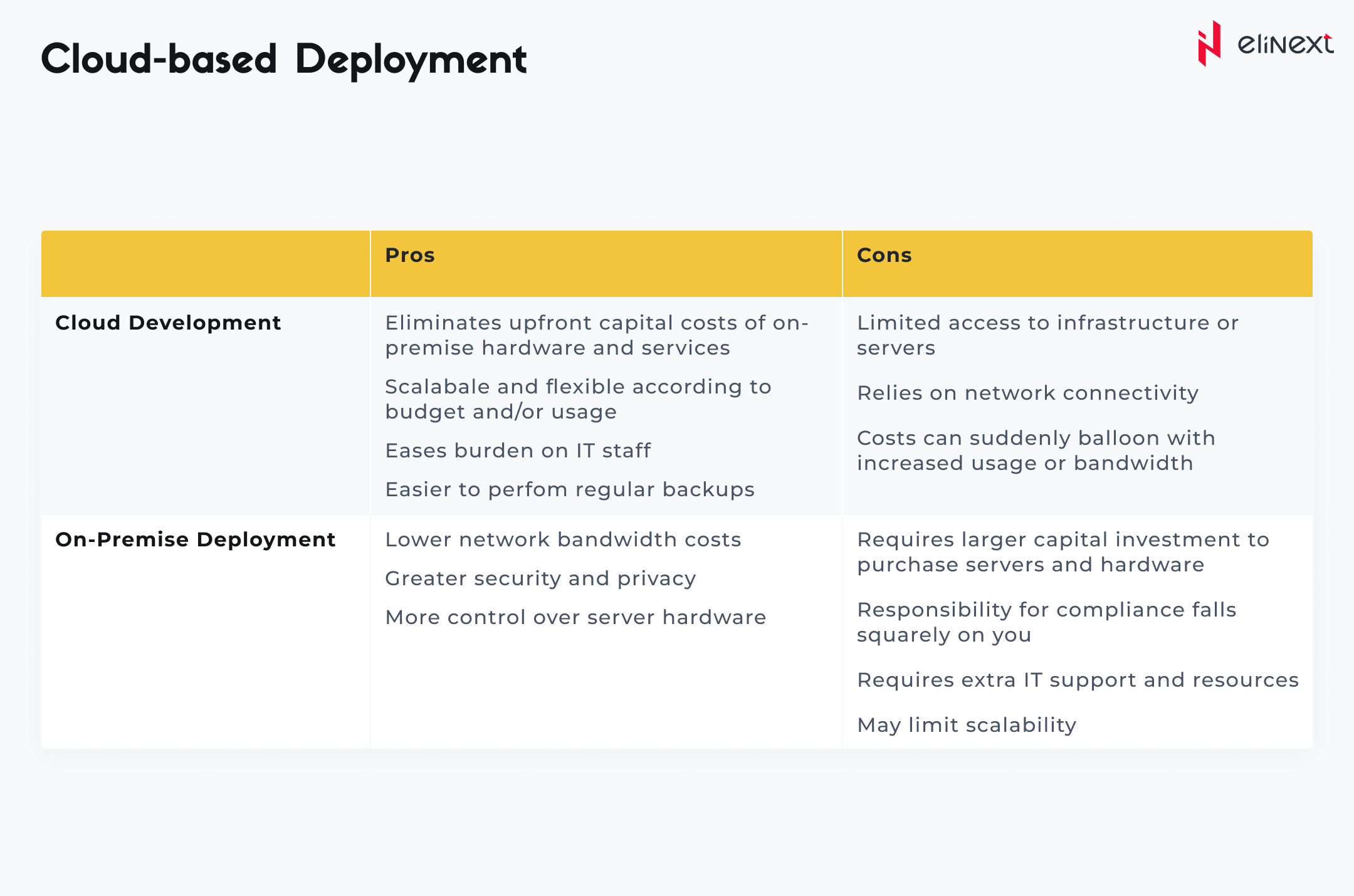 Cloud-based deployment means you rent an internet space from a third party, and store your data on remote servers. This solution is convenient as it has no upfront costs and requires no additional staff to maintain hardware. In contrast to on-premise deployment owners, the cloud one has limited access to their data and may encounter security bridges or unwanted data accesses.