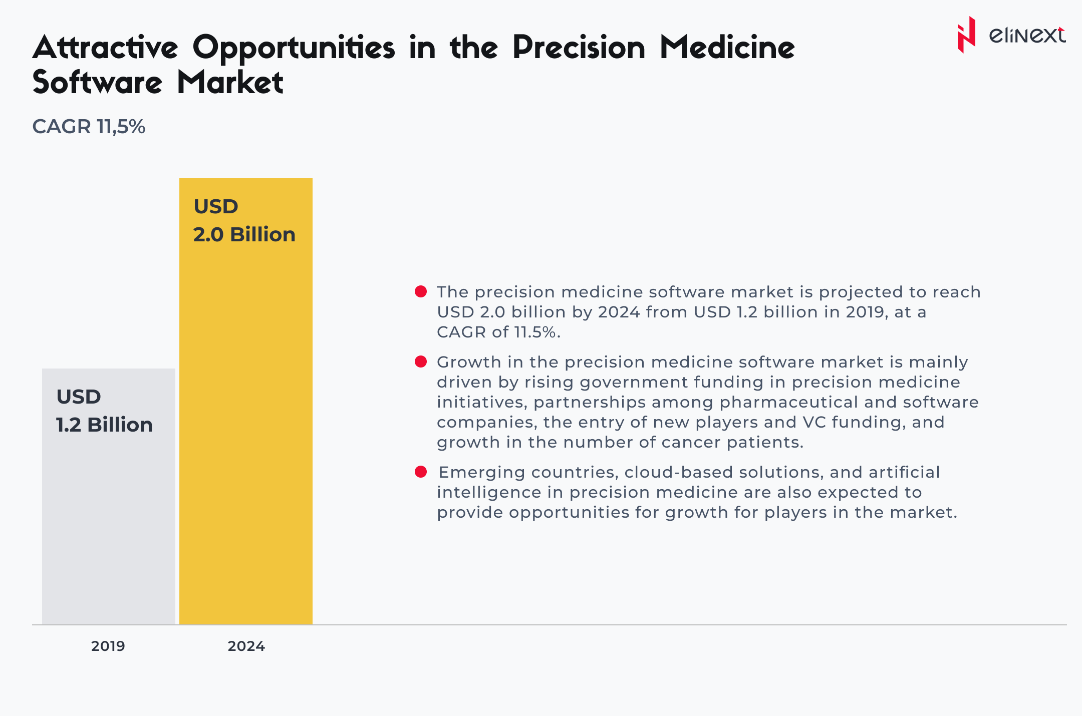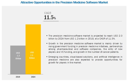 Experts estimate that the growth of Precision Medicine Software may reach 2.0 billion USD in 2024. This growth is due to the improved partnership among pharmaceutical and medicine software markets, as well as government funding for precision medicine initiatives.