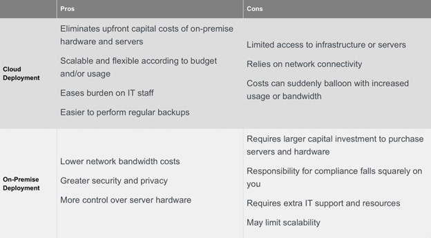 On-premise deployment means you purchase servers and routers necessary to host your data. This solution is very secure and provides unlimited access to the servers. Nevertheless, the upfront costs of the servers, and IT staff to maintain it, makes the on-premise deployment significantly more expensive than cloud-based deployment.